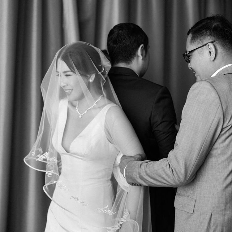 Another challenge for us, to write in french for Karina’s Wedding Veil. It was an exciting project and we took a lot of amount of time to work on this, make sure we use the correct size, and make sure the letters’ legibility and so on. We gave Karina the digital file and she had her team to execute on the embroidery. And see how it turns out. So pretty, right?