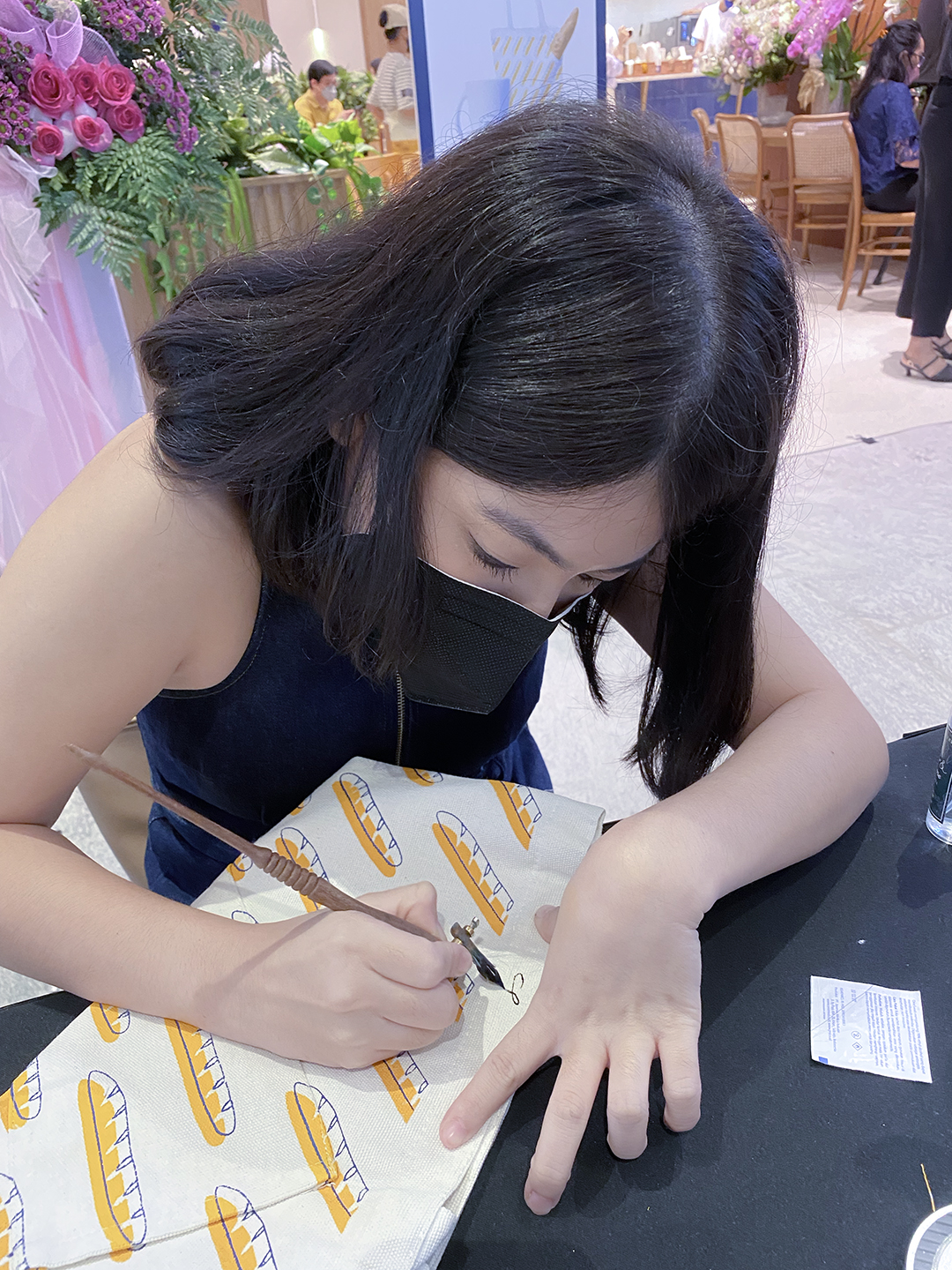 Doing live calligraphy is our current favorite thing to do. We’d love to meet new people and get to know each other through events like this. This time our client is Paris Baguette, the famous bakery cafe from South Korea for their 1st branch opening at Ashta District. We were asked to write down guests’ names on their exclusive canvas tote bags (as shown on the picture taken from the guests’ post). Too bad we don’t have many pictures of the event, but we had fun!